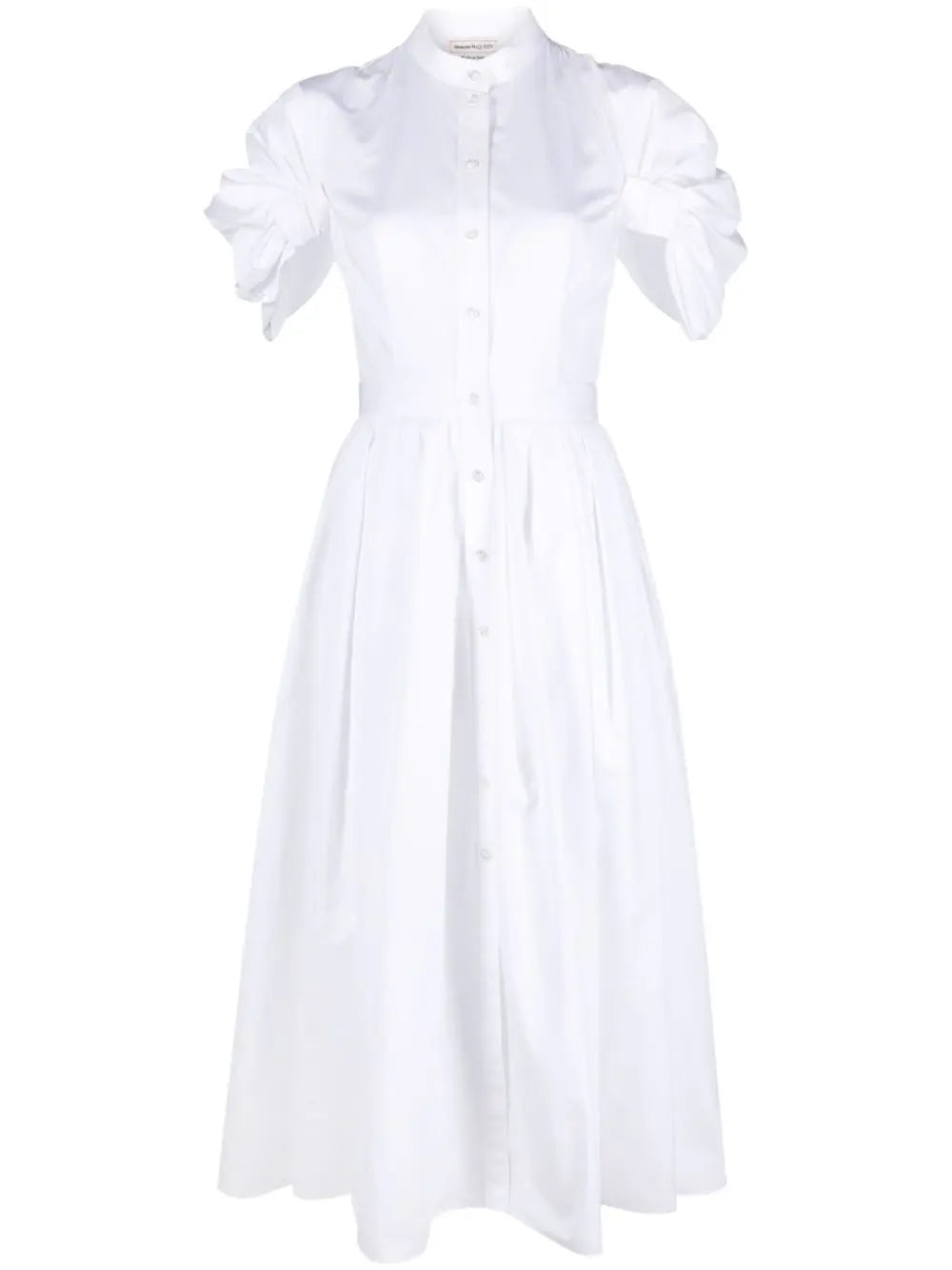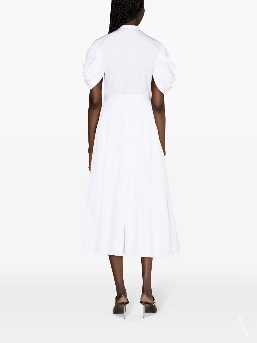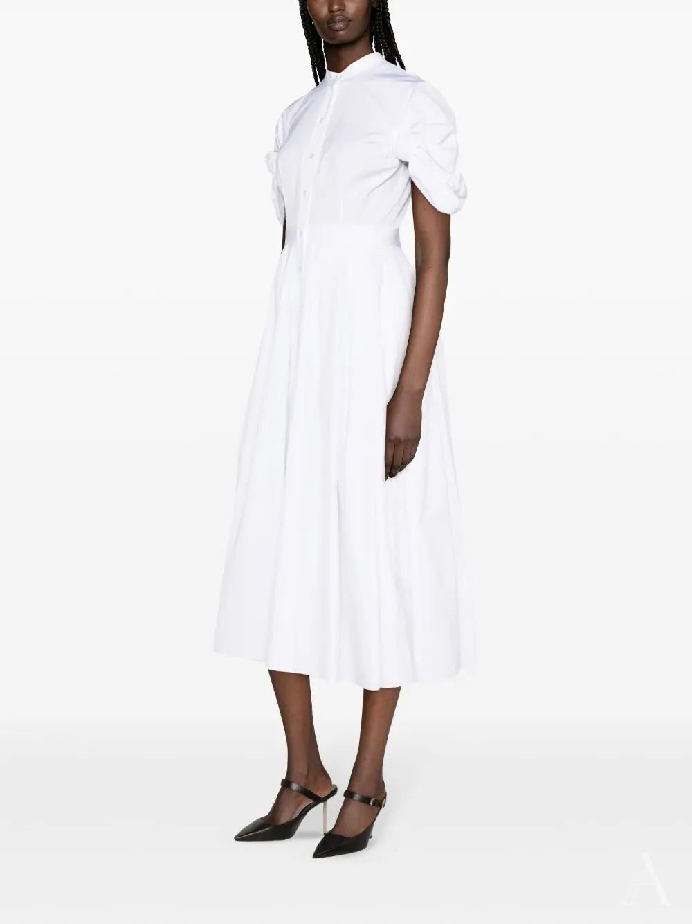 textura de popelina de algodón blanca botones con logo en relieve detalles fruncidos cuello tipo banda cierre frontal con botones mangas cortas abullonadas falda plisada cintura entallada dos bolsillos laterales insertados largo largo dobladillo recto sin forro vestido midi de algodón orgánico Talla y ajuste - Esta prenda tiene un ajuste fiel a la talla. Recomendamos que elijas tu talla habitual. La modelo mide 1,75 m / 5 pies 8 pulgadas y lleva la talla 40 (IT)