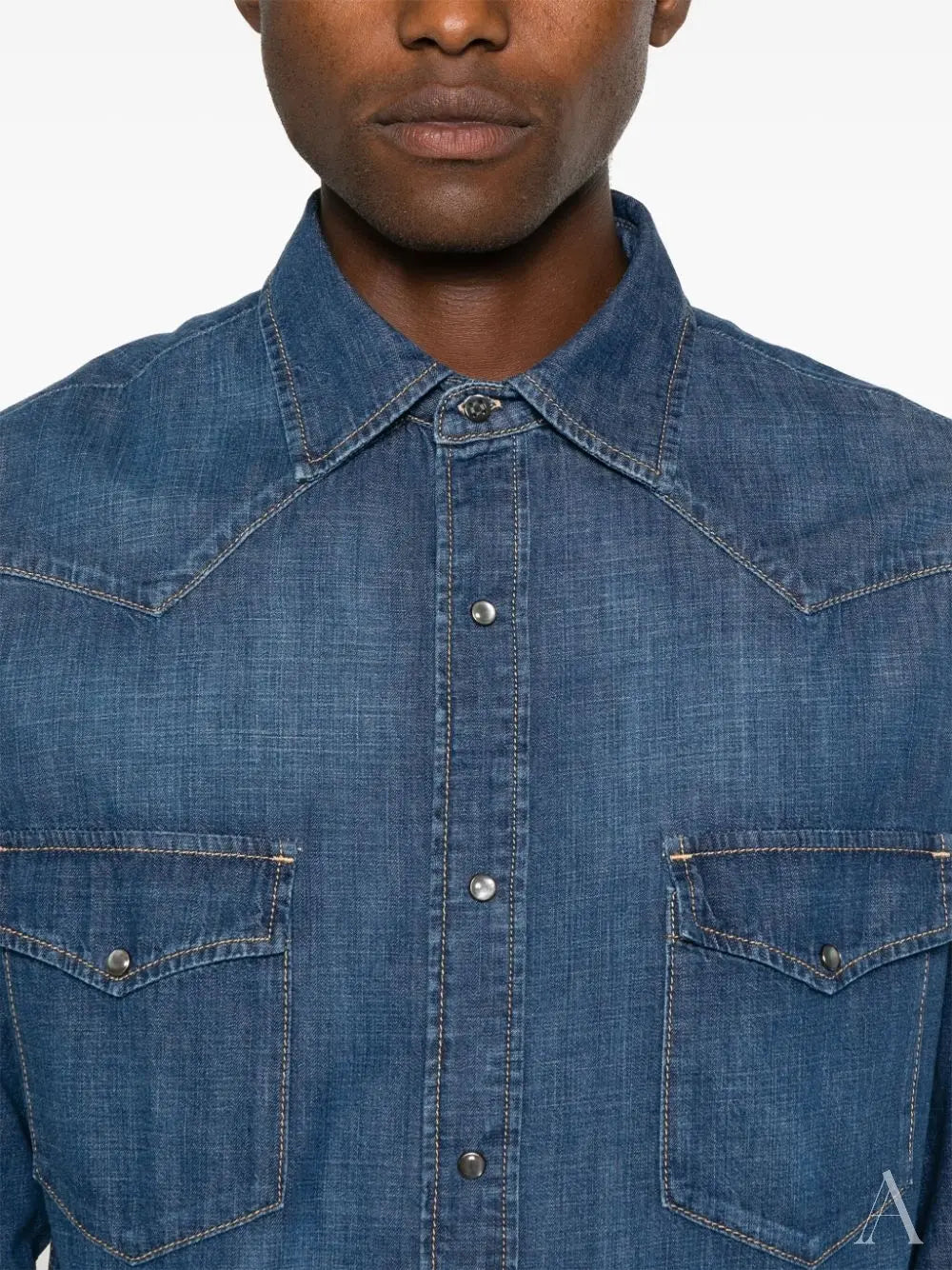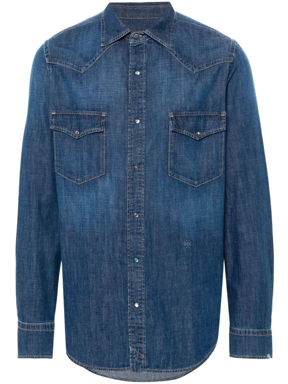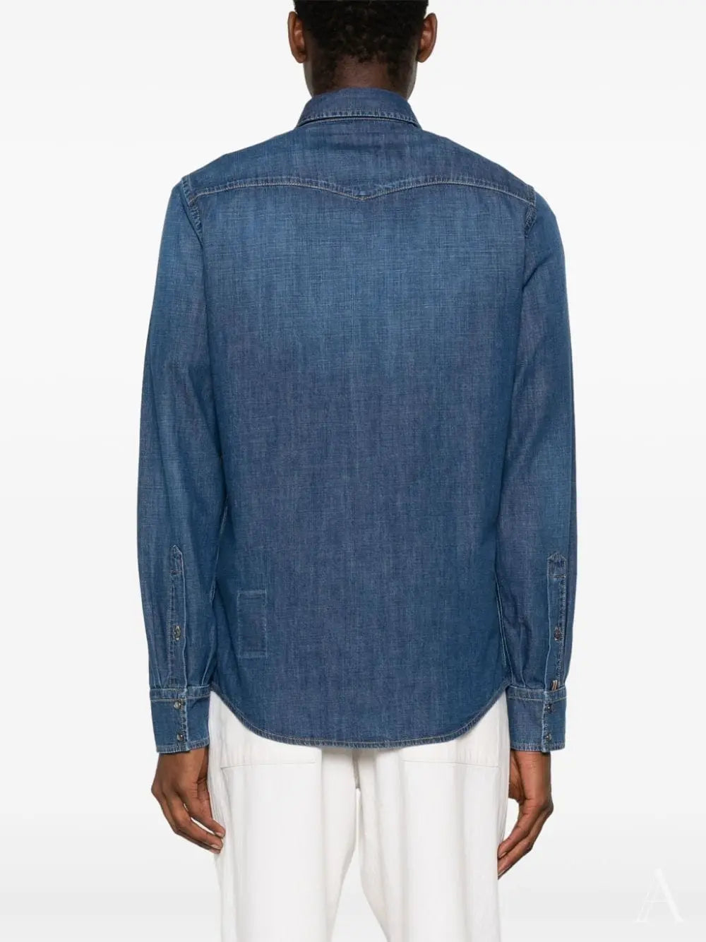 mezclilla de algodón azul claro estilo Western con cuello abierto, cierre frontal con botones a presión, mangas largas con puños de botones a presión, dos bolsillos en el pecho con cierre de botón a presión, dobladillo curvado Talla y ajuste - Esta prenda tiene un ajuste fiel a la talla. Recomendamos que elijas tu talla habitual. El modelo mide 1,84 m / 6 pies 1 pulgada y lleva la talla M