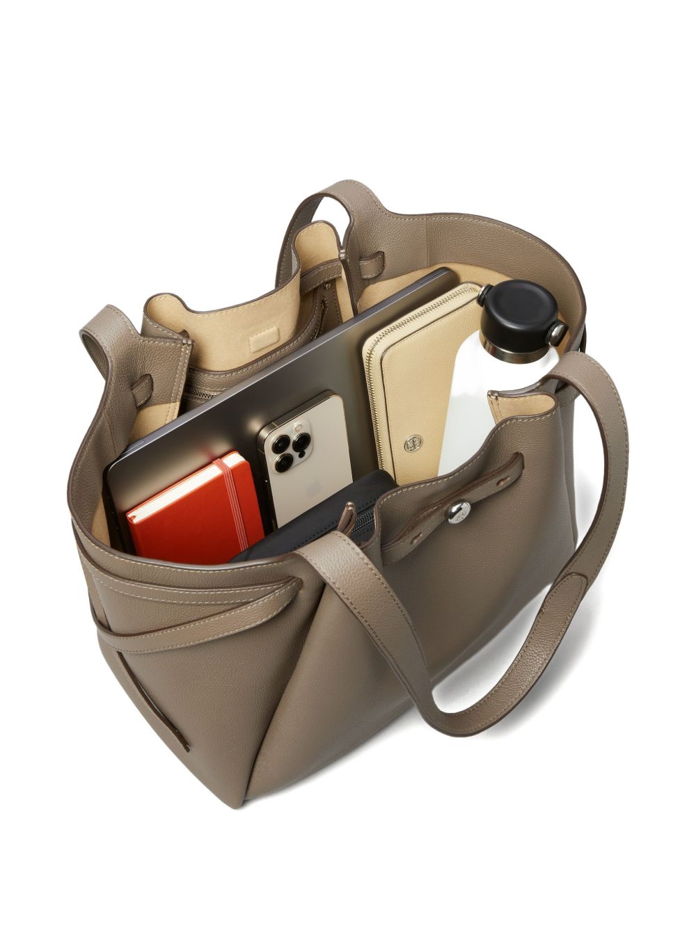gray leather texture dual top handles drawstring closure side straps open interior Romy leather tote bag Size and Fit - DEPTH 17 cm. HANDLE 31 cm. HEIGHT 29 cm. WIDTH 31 cm.