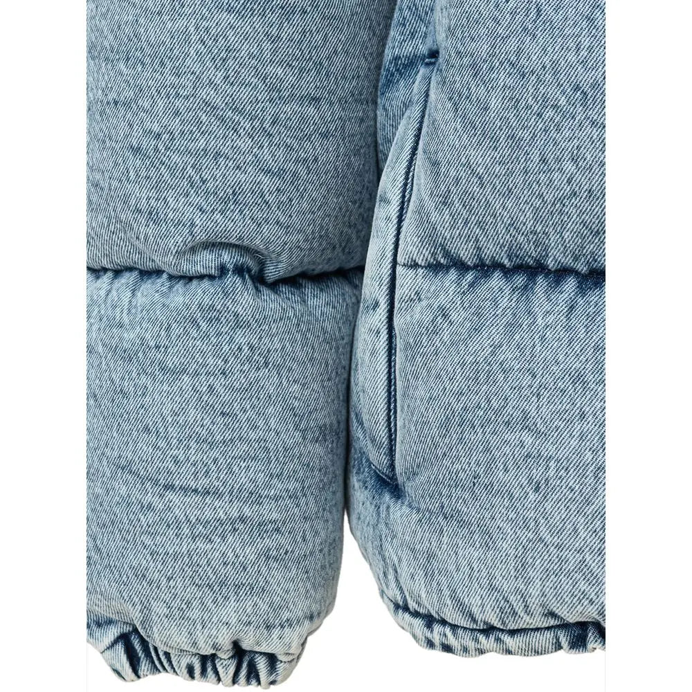 Puffy down jacket in Miu Miu denim. Covered front zipper and button closure, two zippered side pockets, removable hood.Applied logo on back. Puffy pattern, fully padded, elastic cuffs and adjustable drawstring waist. Inner SKU: 24 LU 10. Composition: 100% Polyester-Inner SKU:24LU10