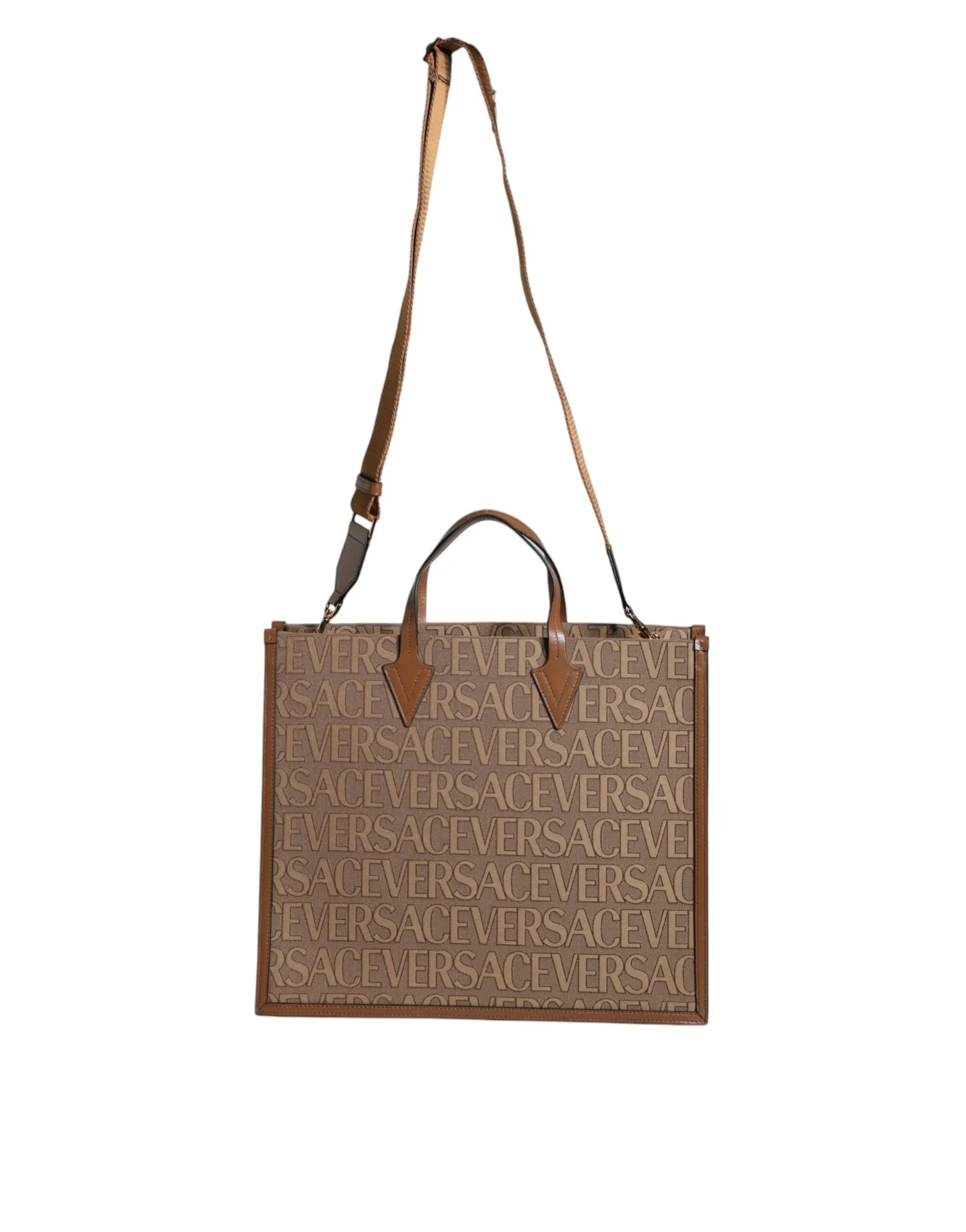 Brown Top Handle Jacquard Leather Logo Crossbody Tote Bag Versace