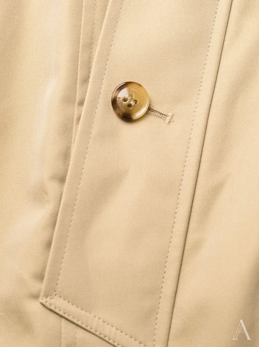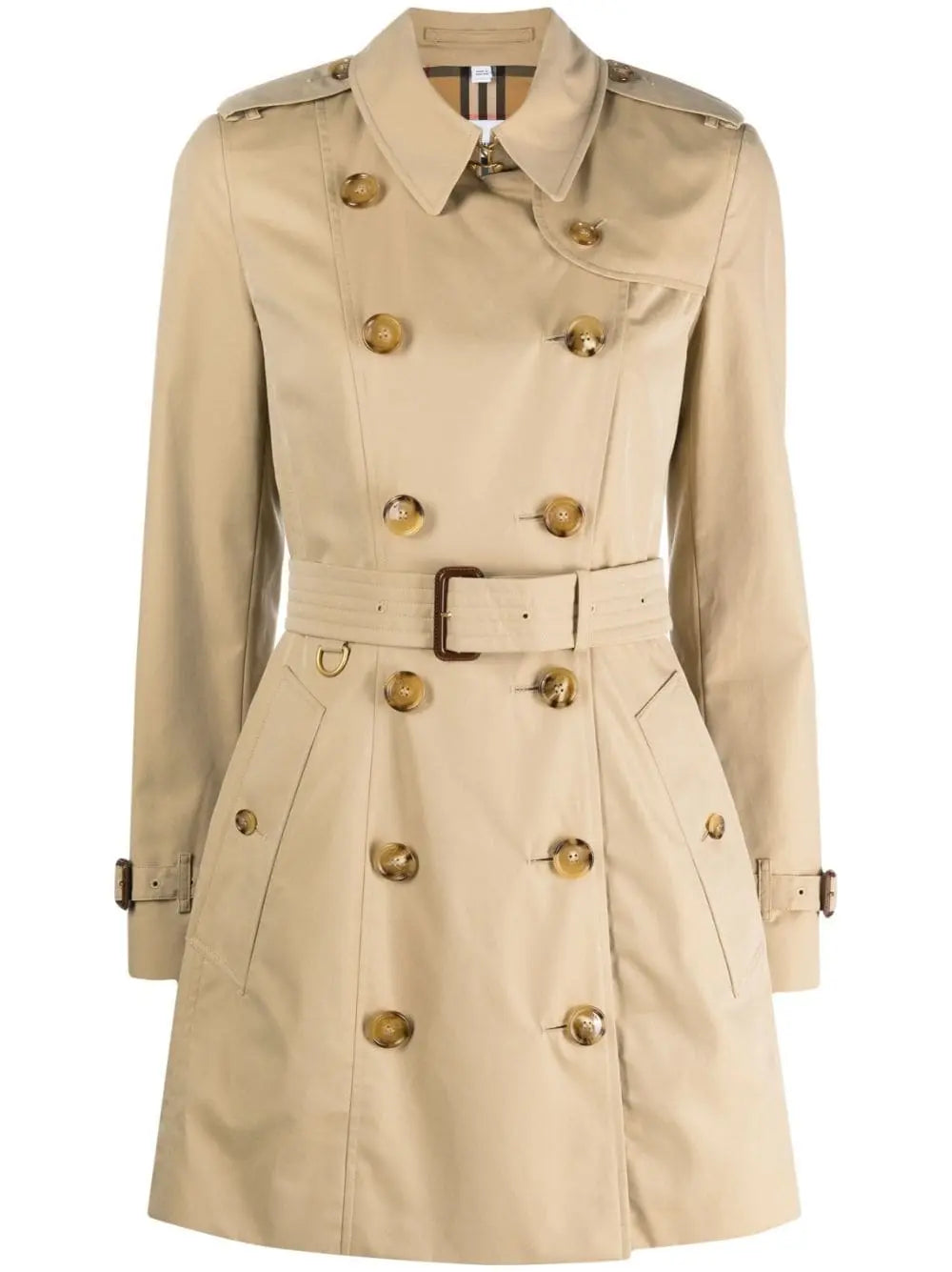 Short trench coat from BURBERRY featuring gabardine weave, epaulettes, storm flap, classic collar, double-breasted button fastening, belted waist, two button-fastening pockets, long sleeves, belted cuffs, thigh-length and camel beige. Size and Fit - This piece fits true to size. We recommend you get your regular size. Model is 1,75m / 5ft 8in wearing size 8 (UK)