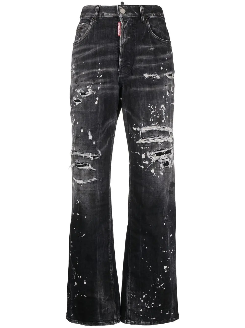 distressed bootcut jeans from DSQUARED2 featuring black, cotton blend, distressed effect, paint splatter detail, belt loops, front button fastening, classic five pockets and bootcut. roadie, gamba larga Roadie denim jeans Size and Fit - This piece fits true to size. We recommend you get your regular size. Model is 1,75m / 5ft 8in wearing size 40 (IT)